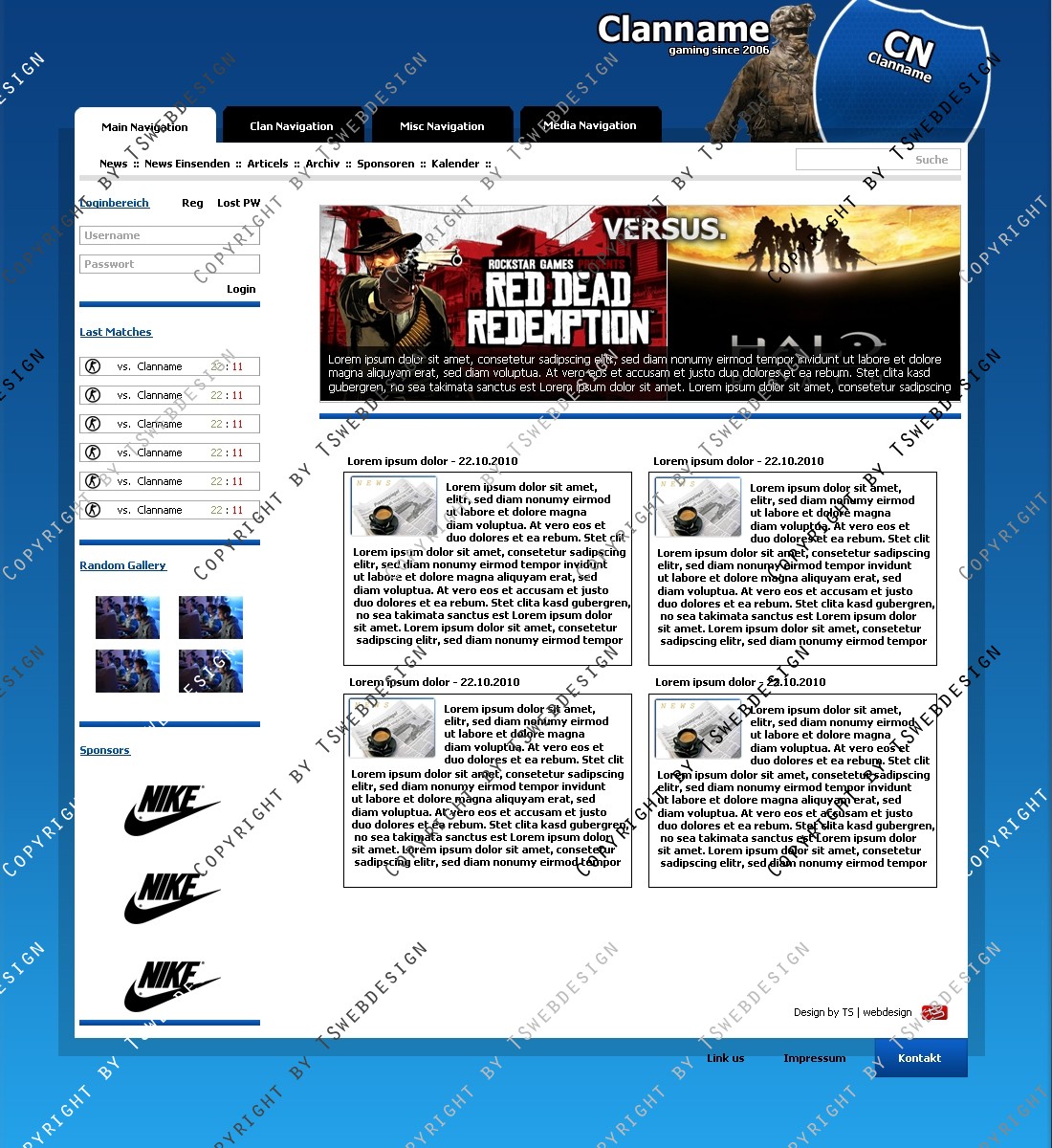 Ein super Design für ein Clan. Die Farben sind  Blau-Weiß , auch änderbar als Zusatzmodul. Oben eine Figur von Mordern Warfare 2, dort können natürlich auch andere Darsteller hin designed werden, dass ist Ihnen überlassen. Das Logo habe ich passend zur page gemacht wo man nur noch den Clanname etc. richtig umbennen muss.
