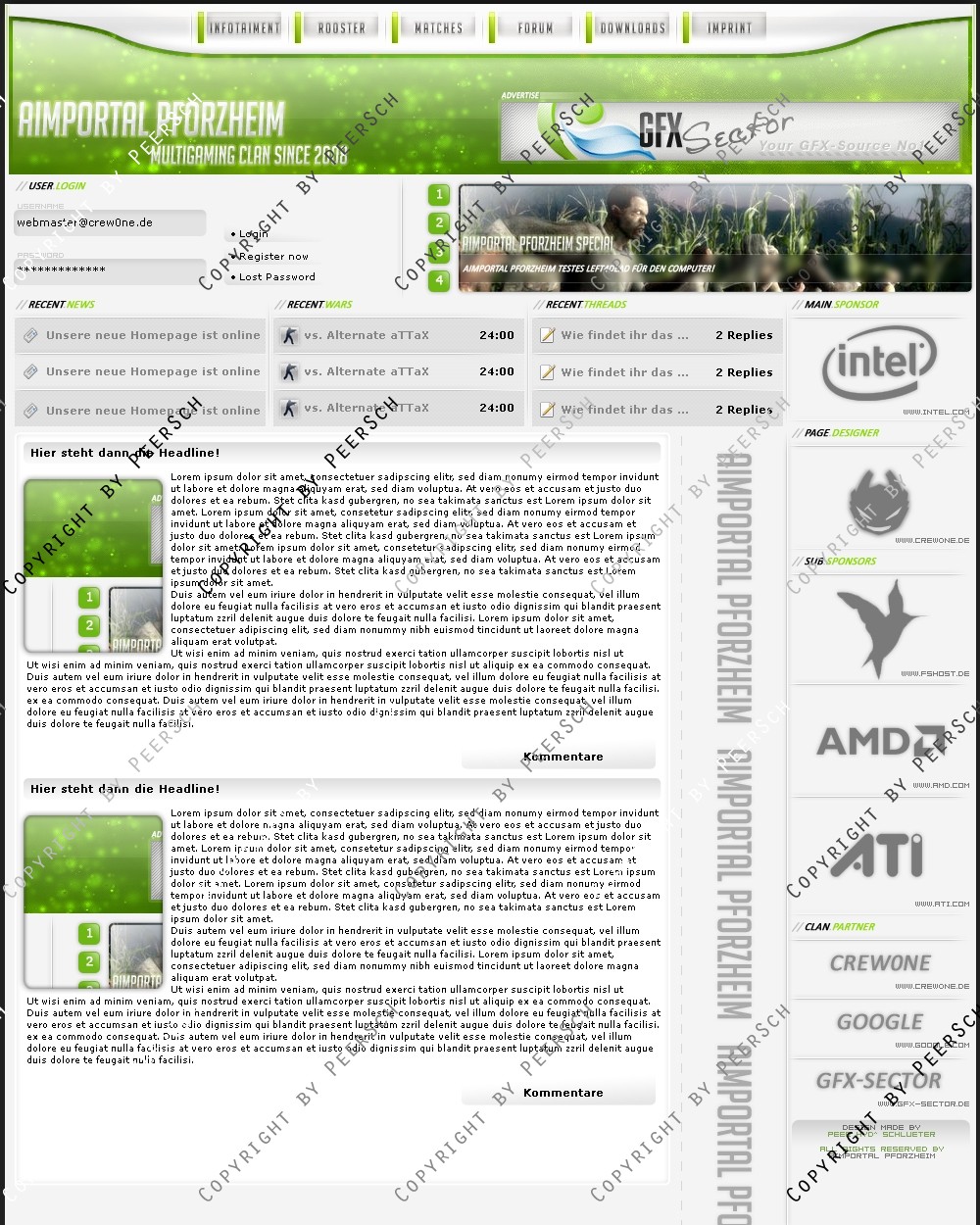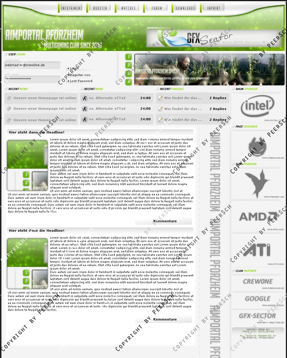 Zu einem meiner Meinung nach unschlagbaren Preis! Was Sie hier kaufen ist lediglich die PSD Datei, gerne kann ich es Ihnen gegen einen Aufpreis von 12,50€ an ein CMS Anpassen, zur Auswahl stehen hierbei: webSPELL, Clansphere, Teklab, Devilz und andere CMS auf Anfrage ohne Aufpreis.