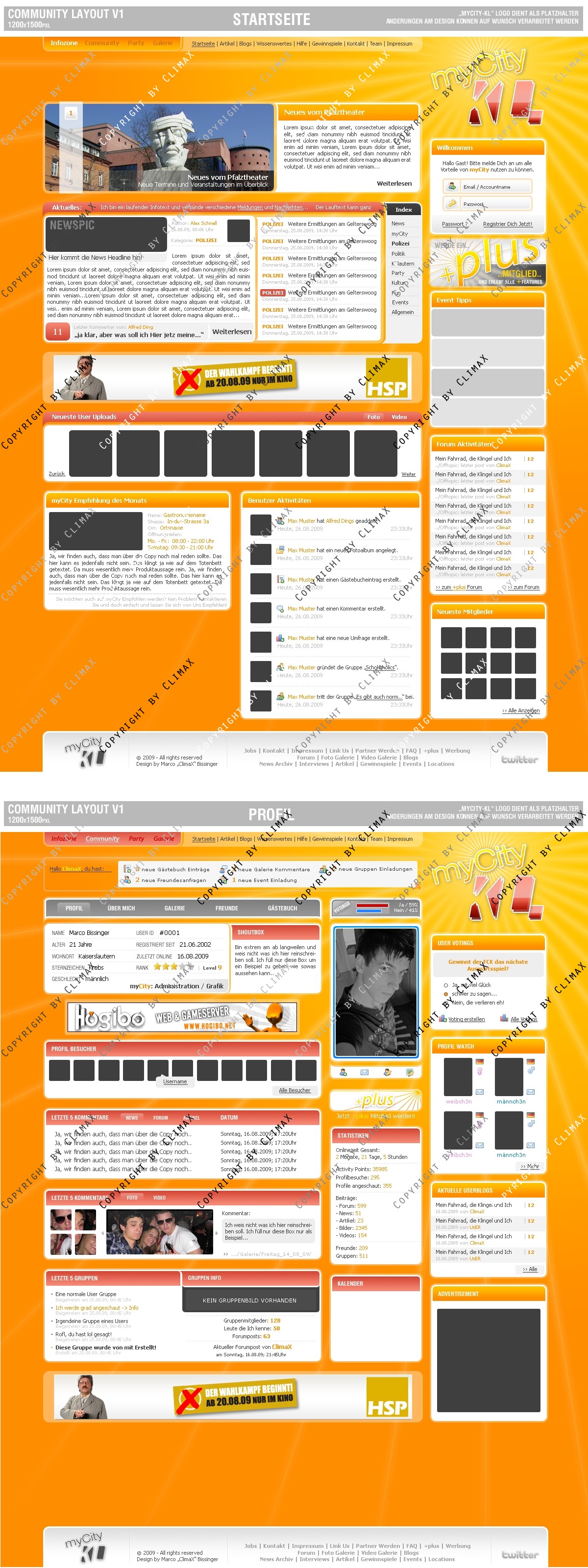 Stelle hier ein Layout für Event / Party Communitys zum Verkauf. Die Startseite sowie die Profilansicht stehen als Unterseiten bereit. Das Design war noch nie Online. Änderungen am Layout können natürlich auf Wunsch gemacht werden. Angeboten wird hier nur die .PSD Datei ohne jegliche Anpassung. Das Logo (myCity KL) dient nur als Platzhalter und ist nicht im Angebot mitenthalten. Bei Fragen stehe ich entweder hier oder in meinem Forum zur Verfügung.