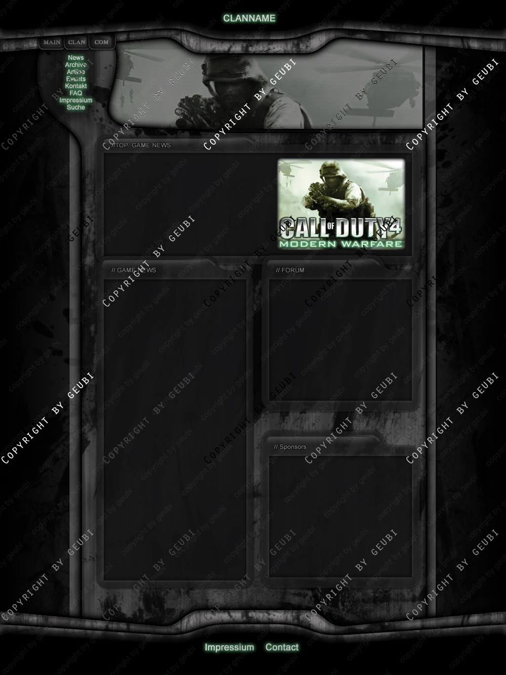 Ausgelegt auf das Spiel Call of Duty 4 bietet das gezeigte Projekt eine schnelle, und für den Kompetenten, eine individualiserende Möglichkeit einem anfänglichen oder schon aufstrebendem Team (ob Liga oder nicht sei dahingestellt) die erste Internetpräsenz aufzuziehen ohne dabei auf Anspruch und Qualität verzichten zu müssen.