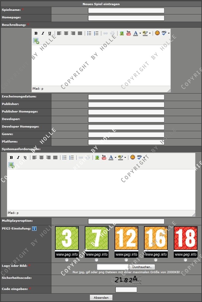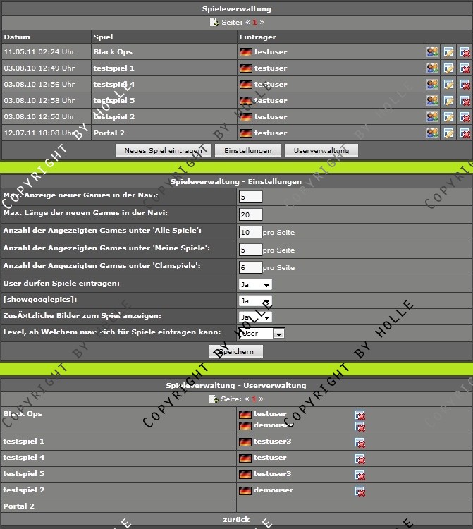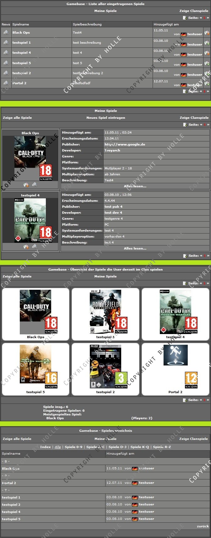 Angelehnt an das System der ESL habe ich hier eine Verwaltung für Spiele im Clan oder in der Community gecode, für die sich Member eintragen können. Zusätzlich können die Member im Clan eigene Spiele einreichen, indem sie ein Formular ausfüllen. (Dieses Feature kann aber vom Admin abgeschaltet werden)